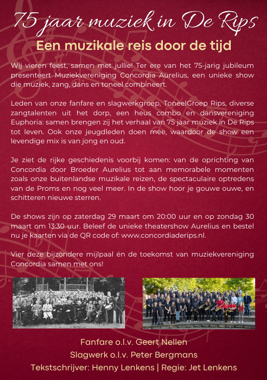Ter ere van het 75-jarig jubileum presenteert Muziekvereniging Concordia Aurelius, een unieke show die muziek, zang, dans en toneel combineert. Leden van de fanfare, slagwerkgroep, ToneelGroepRips, plaatselijke zangtalenten en de lokale dansvereniging Euphoria brengen samen het verhaal van 75 jaar muziek in De Rips tot leven. Ook jeugdleden doen mee, waardoor de show een levendige mix wordt van en voor jong en oud. De show bevat de rijke geschiedenis van Concordia opgericht door Broeder Aurelius tot aan memorabele momenten zoals buitenlandse reizen, de spectaculaire optredens van de Proms en nog veel meer.